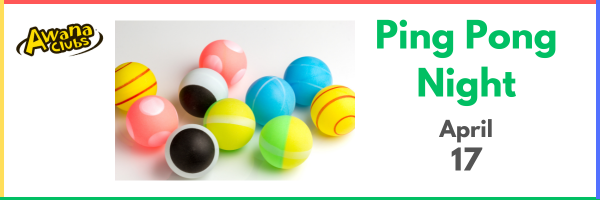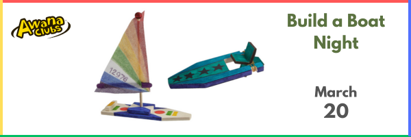 Join us for our very own Awana Regatta. Clubbers earn participation points for bringing their decorated boats. (Boat kits will be distributed to clubbers starting 2/27.) New clubbers and families are welcome! 5:00 pm - Dinner for clubbers, families, and leaders 6:00 pm - Club starts in the Lower Auditorium 7:30 pm - Parents pick...